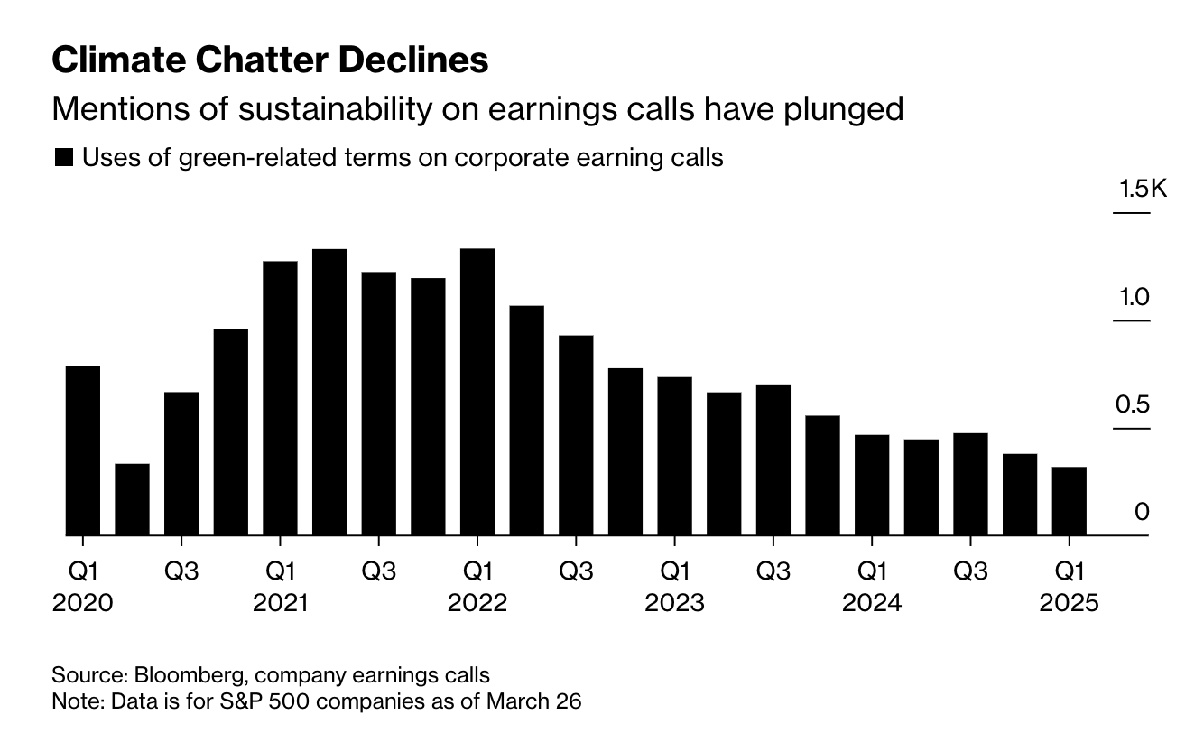 America’s CEOs are talking about climate change less than they used to, according to Bloomberg’s analysis of corporate earnings transcripts.