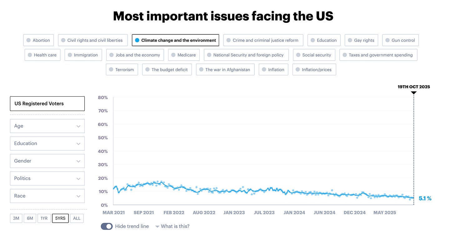 Look at polling data and you’ll see a similar trend. In 2021, 16% of American voters ranked climate as one of their top issues. Today just 5% do.