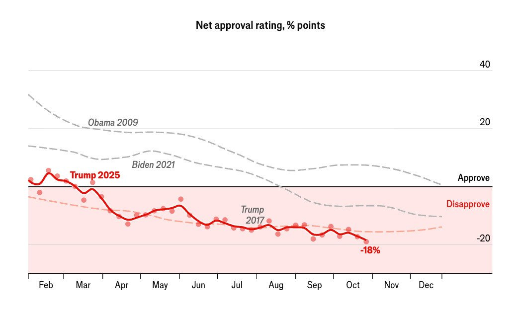 Young Americans are even less happy with Trump. After the 2024 election there was a lot of talk about young Americans shifting to the right. A year later, Trump’s net approval rating among young people is -40% and falling, according to The Economist’s polling.