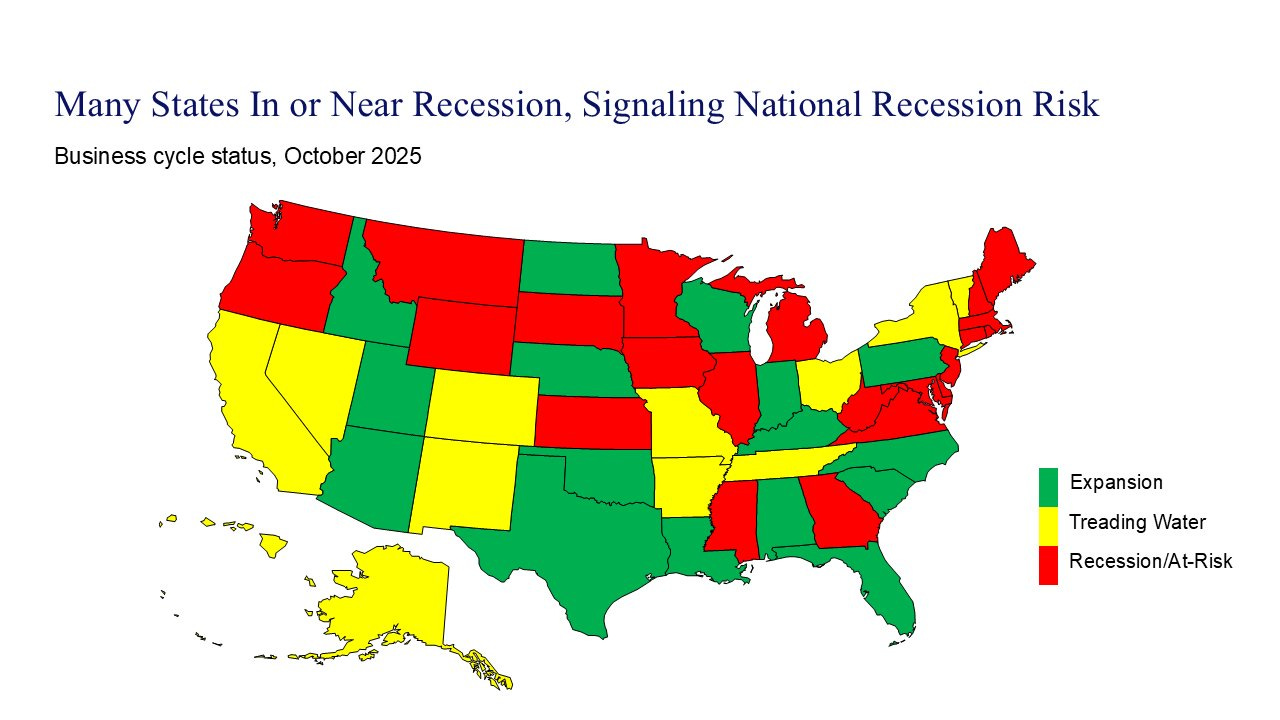 Kyla Scanlon coined the term “vibecession” to describe the gap between macroeconomic measures that economists love to look at and people’s vibes of the economy. This week she published this chart on her newsletter showing that many states are in or near a recession.