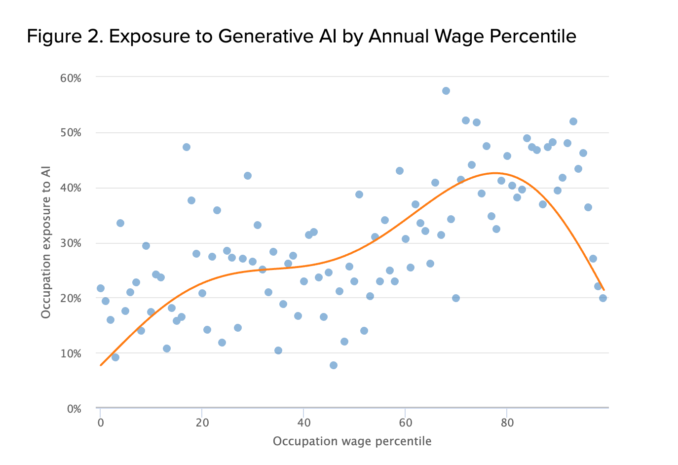 As the authors of the study write, “Occupations at the bottom of the wage distribution are the least exposed to AI, since many of these jobs are predominantly manual labor or personal services. Exposure generally rises with earnings until the 80th-90th percentiles, which include programmers, engineers, and other professionals.”