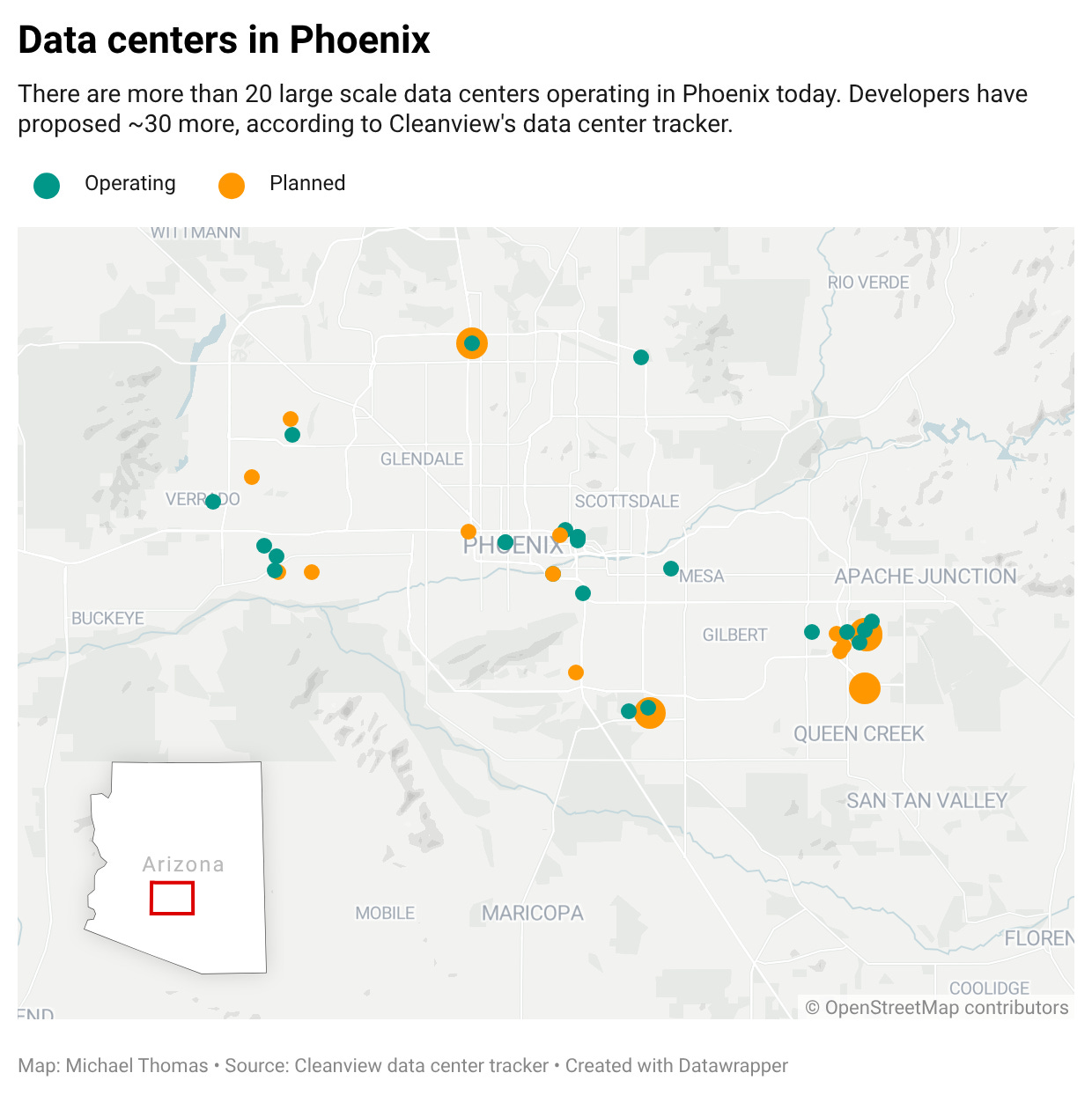 Few places in the world are seeing more demand from data centers than Phoenix. In the last few years, developers and tech companies have built more than a dozen large-scale data centers. The combined capacity of operating data centers in Arizona is now more than 2,000 MW, according to Cleanview’s data center tracker.