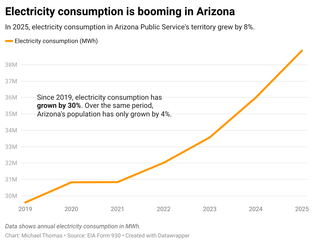 Already data centers are causing electricity demand to rise faster in Arizona than almost any other place in the country. In 2025, electricity demand in Arizona grew by 8%—a growth rate 4x larger than that of the United States as a whole.