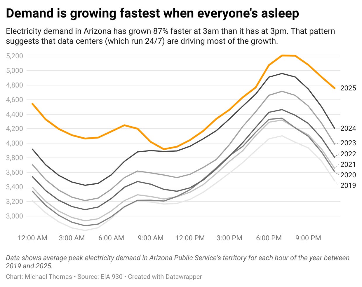 Utilities have found a way to accommodate many of the requests, however. Nighttime electricity demand—a good proxy for data center demand in Arizona—grew by 45% between 2019 and 2025.