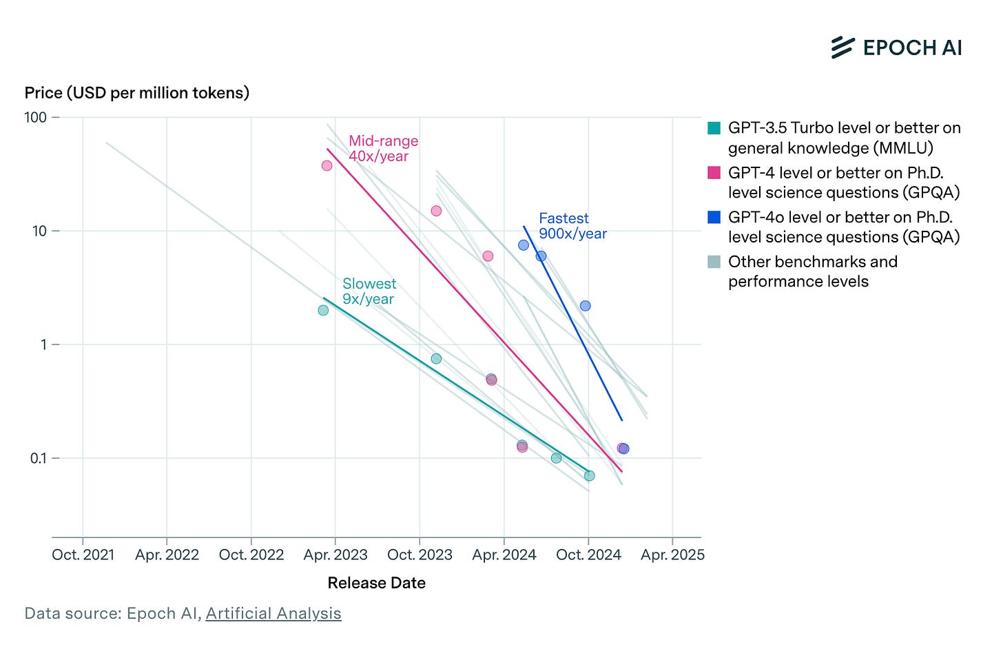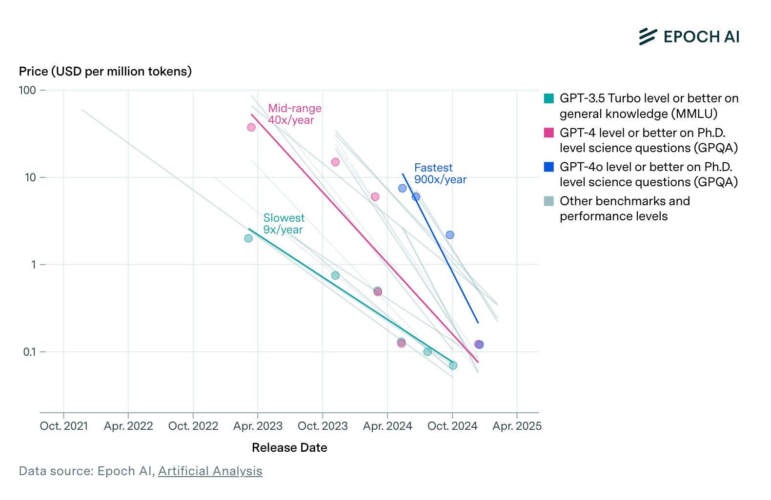 The price to achieve GPT-4’s performance on a set of PhD-level science questions fell by 40x per year. The rate of decline varies dramatically depending on the performance milestone, ranging from 9x to 900x per year.