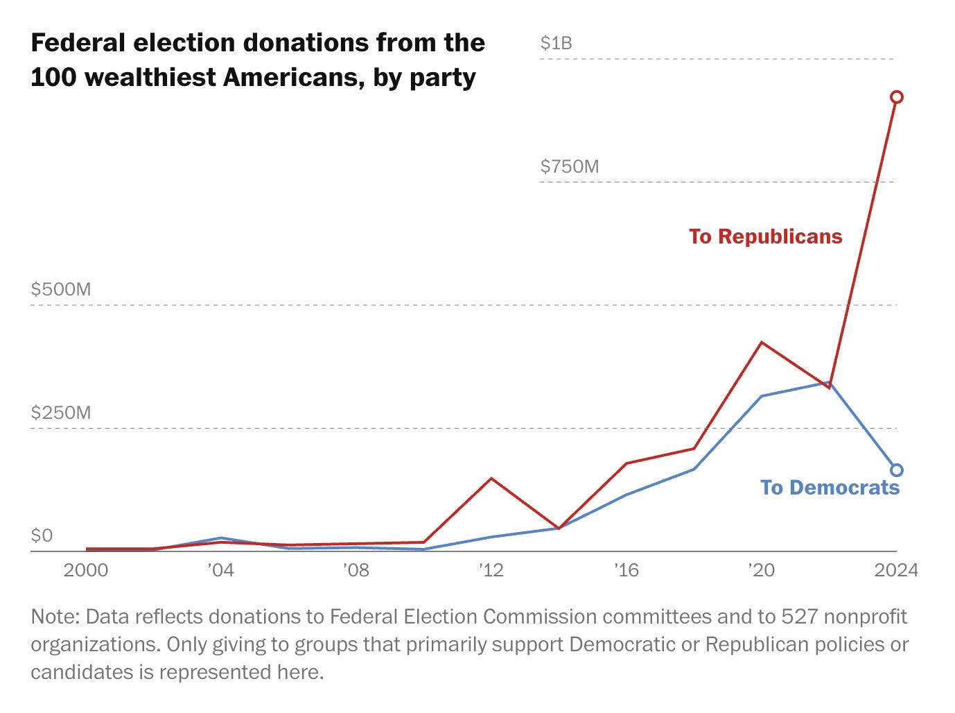 Overall, billionaires have rallied behind Trump’s Republican Party. More than 80 percent of the federal campaign spending by the 100 wealthiest Americans in 2024 went to Republicans, The Post found. Trump himself raised 15 times as much from the 100 richest Americans in 2024 than he did during his first presidential campaign, in 2016.