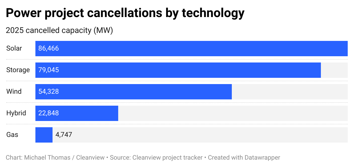 Clean energy projects have been hit hardest, accounting for 93% of project cancellations in 2025. Utility-scale solar alone saw 86 GW canceled, while battery storage projects lost 79 GW and wind projects shed 54 GW.