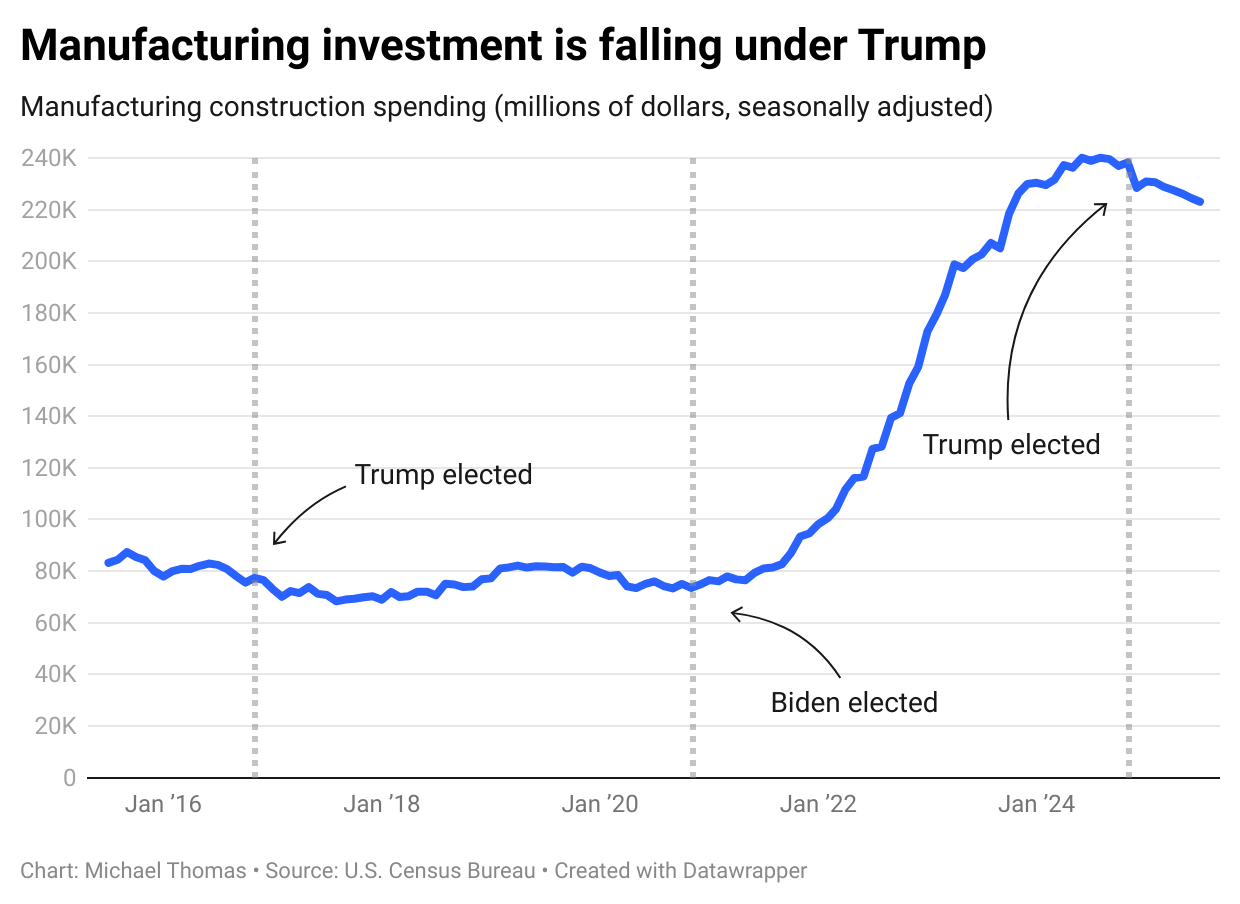 During Trump’s first term, manufacturing construction investment grew by 5%. Under Biden, it grew by 279%—thanks to industrial policies like the CHIPS Act and Inflation Reduction Act (RIP). Since Trump took office again, manufacturing spending has been falling steadily.
