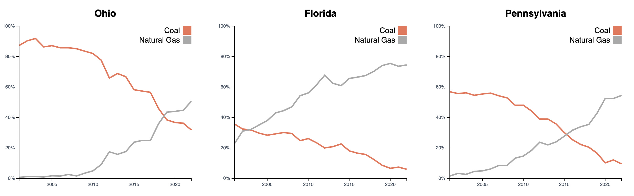 That’s why few environmentalists are celebrating the fact that states like Ohio, Florida, and Pennsylvania are replacing much of their coal power with natural gas.
