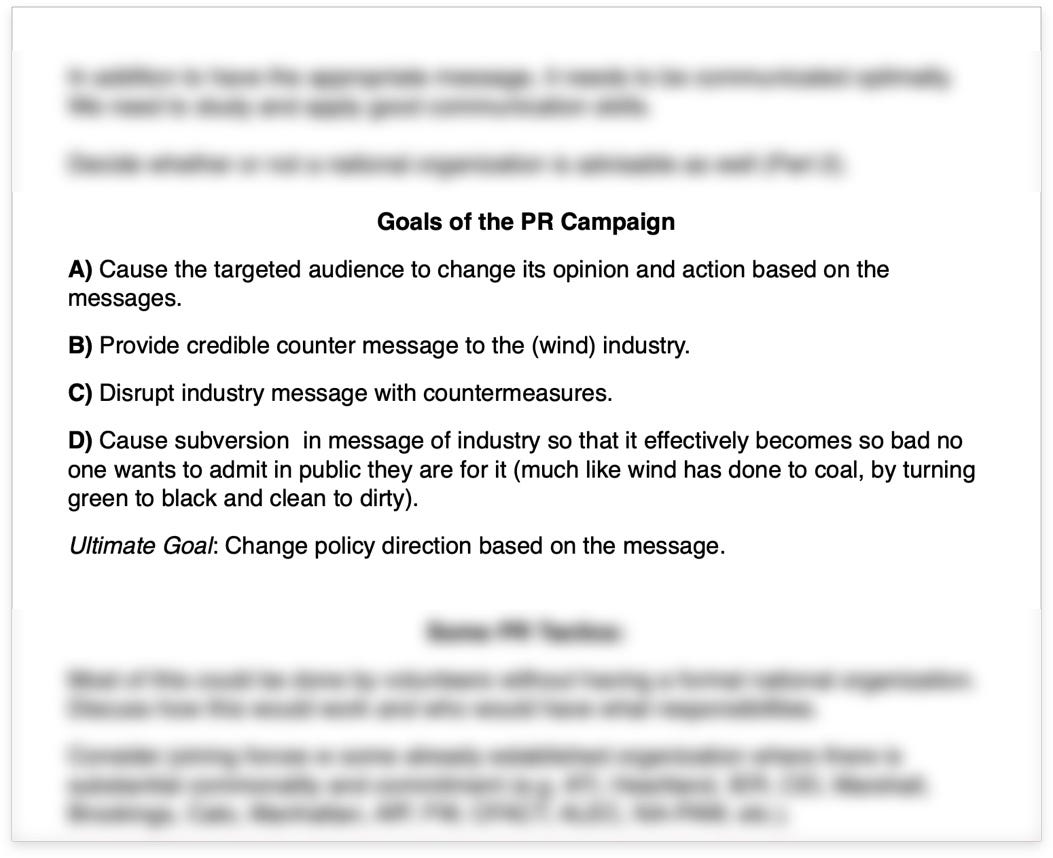 What’s the goal of this PR? As he wrote, “Public opinion [on clean energy] must begin to change among citizens at large.” But changing minds wasn’t all Droz was interested in. The next line in his memo reads: “Ultimate Goal: Change policy direction based on the message.”