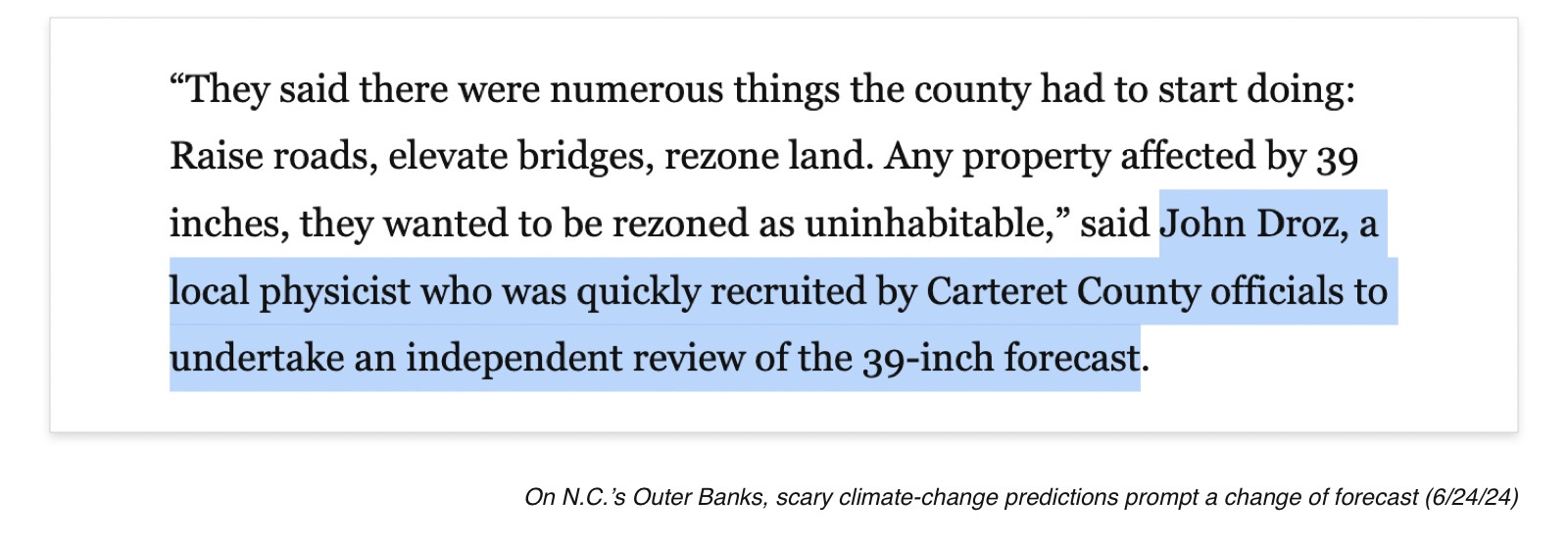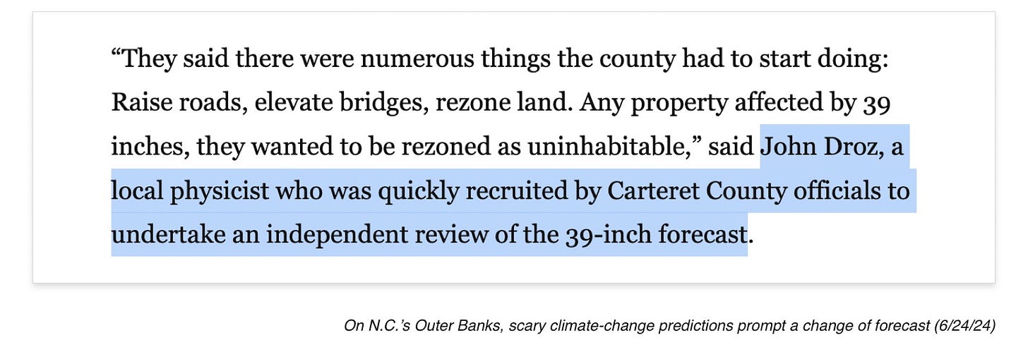 Remarkably, many legislators listened to him. Even the Washington Post listened to him. In an article about sea-level rise, they quoted the real estate developer as a "local physicist."