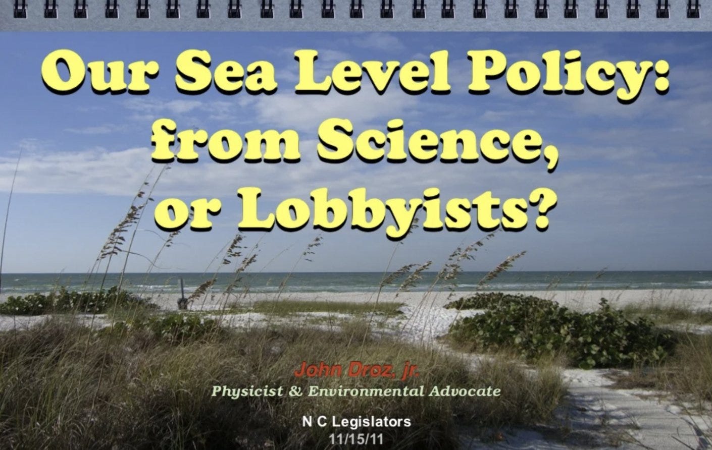 For most of his life, Droz was a semi-retired real estate developer. In 2011, he reinvented himself and became a "physicist." That year, his home state of N.C. debated a bill about climate change. Droz put together a series of presentations, some as long as 168 slides, and headed to the capital. He had crunched the numbers and looked at the science. According to Droz, climate change was a sham pushed by clean energy lobbyists.