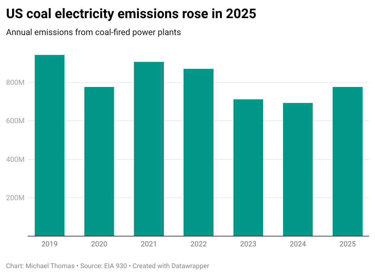 Carbon emissions from the power grid rose by 4.4% in 2025, due almost entirely to the growth of coal power generation. That’s more emissions growth than any year since 2021, which was a weird COVID recovery year.