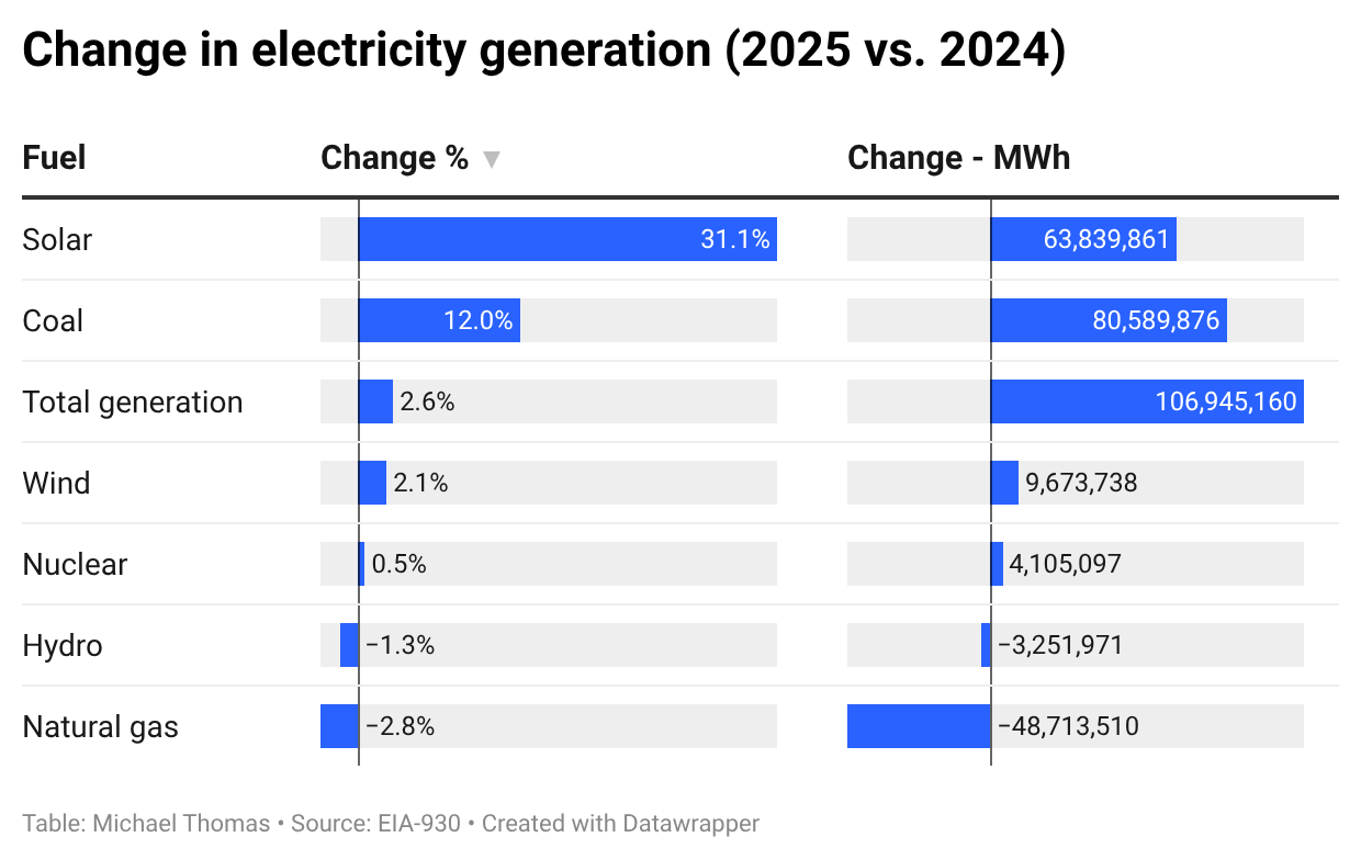 Collectively, the country’s solar and wind projects produced 73.5 million MWh more electricity in 2025 than they did the year before. That’s as much electricity as about 7 million US homes use in a year. Solar’s output grew by 31%, while wind had another sluggish year, only growing by 2%.