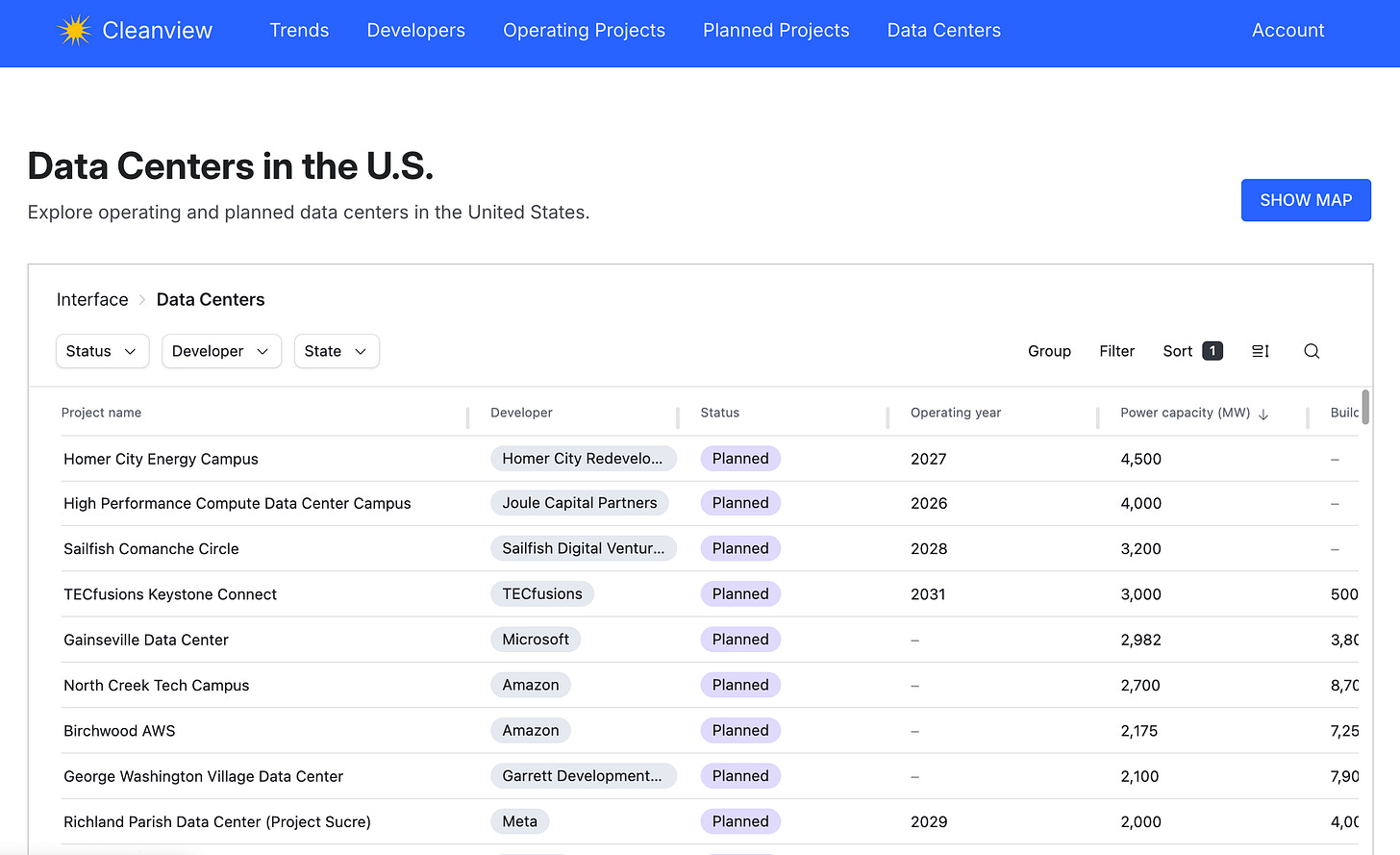 To write this story, I relied on Cleanview’s new data center tracker. Our team spent months going through public records, reviewing satellite images, and scouring the web to build one of the most comprehensive datasets of planned data centers in the US. We’re tracking about 550 planned data centers with a combined power capacity of 125 GW. Each week we track newly proposed projects, permitting updates, and cancellations.