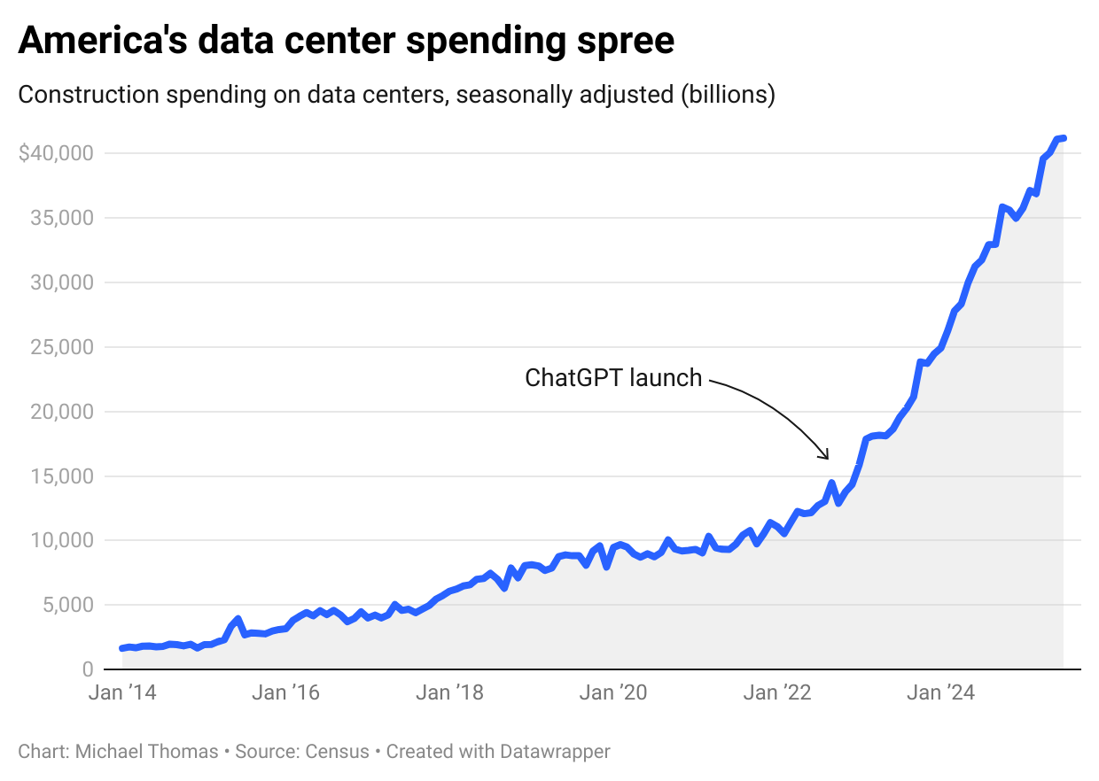 Since the launch of ChatGPT in November 2022, tech companies have spent huge sums of money building data centers. In just three years, spending on data centers in the US has gone from $13.8 billion to $41.2 billion per year—an increase of 200%. This has come at a time when virtually all other construction activity in the country has slowed.