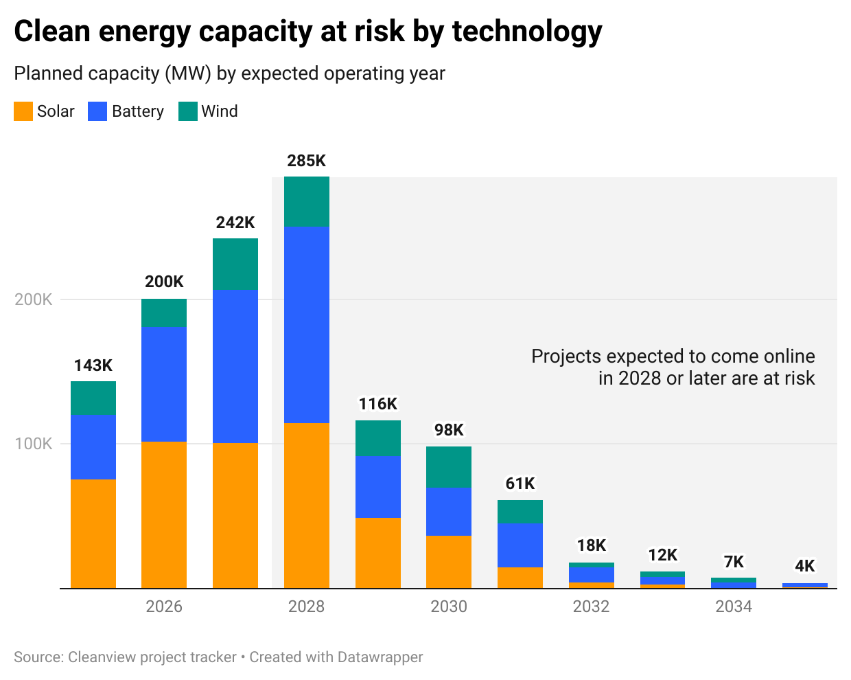 More than 600 GW of clean energy projects scheduled for completion in 2028 or later could lose tax credit eligibility under the new law, threatening their financial viability.