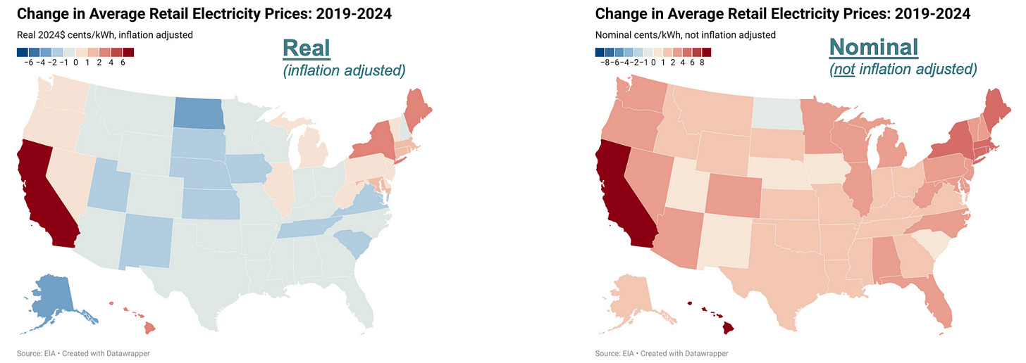 If big tech and their data centers were to blame, you’d expect states like Nebraska and Iowa—where Google is building its largest cluster of data centers—to have some of the fastest growing rates. But inflation-adjusted rates were negative in both states.